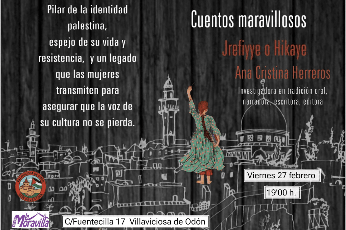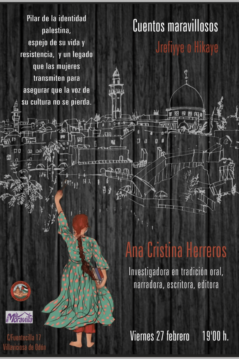El próximo viernes 27 de febrero, a partir de las 19:00 horas, la asociación cultural La Moravilla acoge un acto cultural para dar voz al pueblo palestino a través de la palabra de Ana Cristina Herreros, que con su trabajo de investigación y narración nos devuelve los cuentos tradicionales de Palestina que, como un hilo invisible, se niegan a desaparecer.