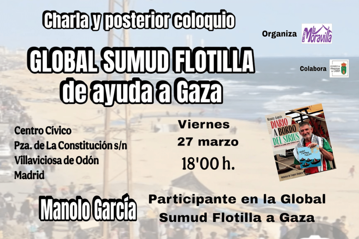La Asociación Sociocultural La Moravilla organiza el próximo viernes 27 de marzo la charla y posterior coloquio «Global Sumud flotilla de ayuda a Gaza» impartida por Manuel García Morales («Manolo Teniente»).