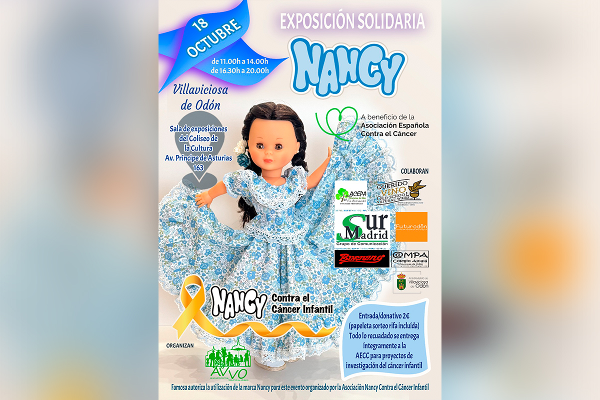 La Asociación Vecinal de Villaviciosa de Odón (AVVO) trae, de nuevo, al municipio la exposición «Nancy contra el Cáncer Infantil», con la colaboración de la Concejalía de Participación Ciudadana del Ayuntamiento de Villaviciosa. Tendrá lugar el sábado 18 de octubre en el Coliseo de la Cultura de 11:00 a 14:00 y de 16:30 a 20:00 horas.