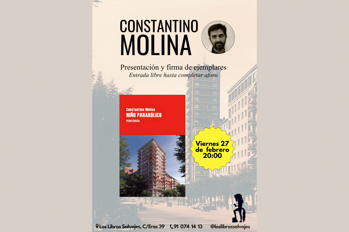 El próximo viernes 27 de febrero Los Libros Salvajes acogen la presentación de «Niño parabólico», de Constantino Molina, a partir de las 20:00 horas.